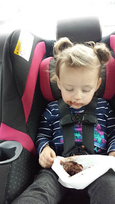 Since Ad's day care is onsite at work it means she gets to spend a whole lot more time with me doing work things. This past week our cath lab manager was leaving and so we were throwing her a good bye party. Ad was so excited that she got to go to the party with me. When I told her it was time to go she was so sad so my co-workers were sure to send her with some cake to brighten her night. She was in heaven!